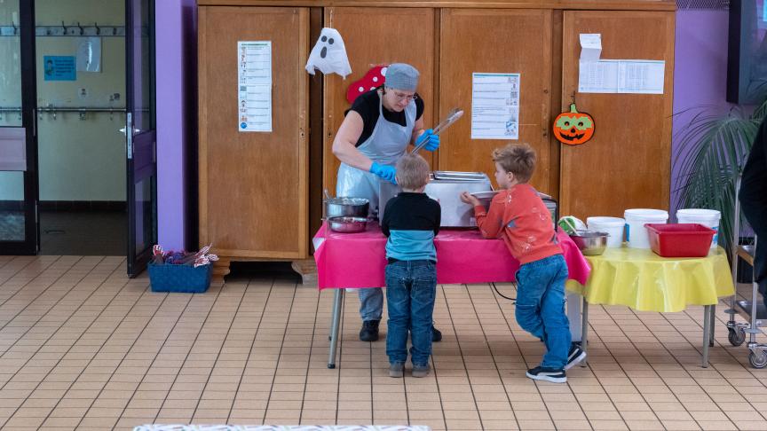 « Il y a une petite différence de coût », reconnaît la joviale cheffe de cuisine, « mais elle est compensée par le repas végétarien hebdomadaire. Un plat sans viande coûte moins cher, et cela nous permet d’acheter une viande locale et de qualité pour les autres jours. » Pour les parents qui inscrivent leur enfant au repas chaud, le prix n’a d’ailleurs pas varié : 2,50 euros en maternelle, 3 euros en primaire. Et en guise de collation, vers 10 h, c’est potage frais gratuit pour tout le monde.