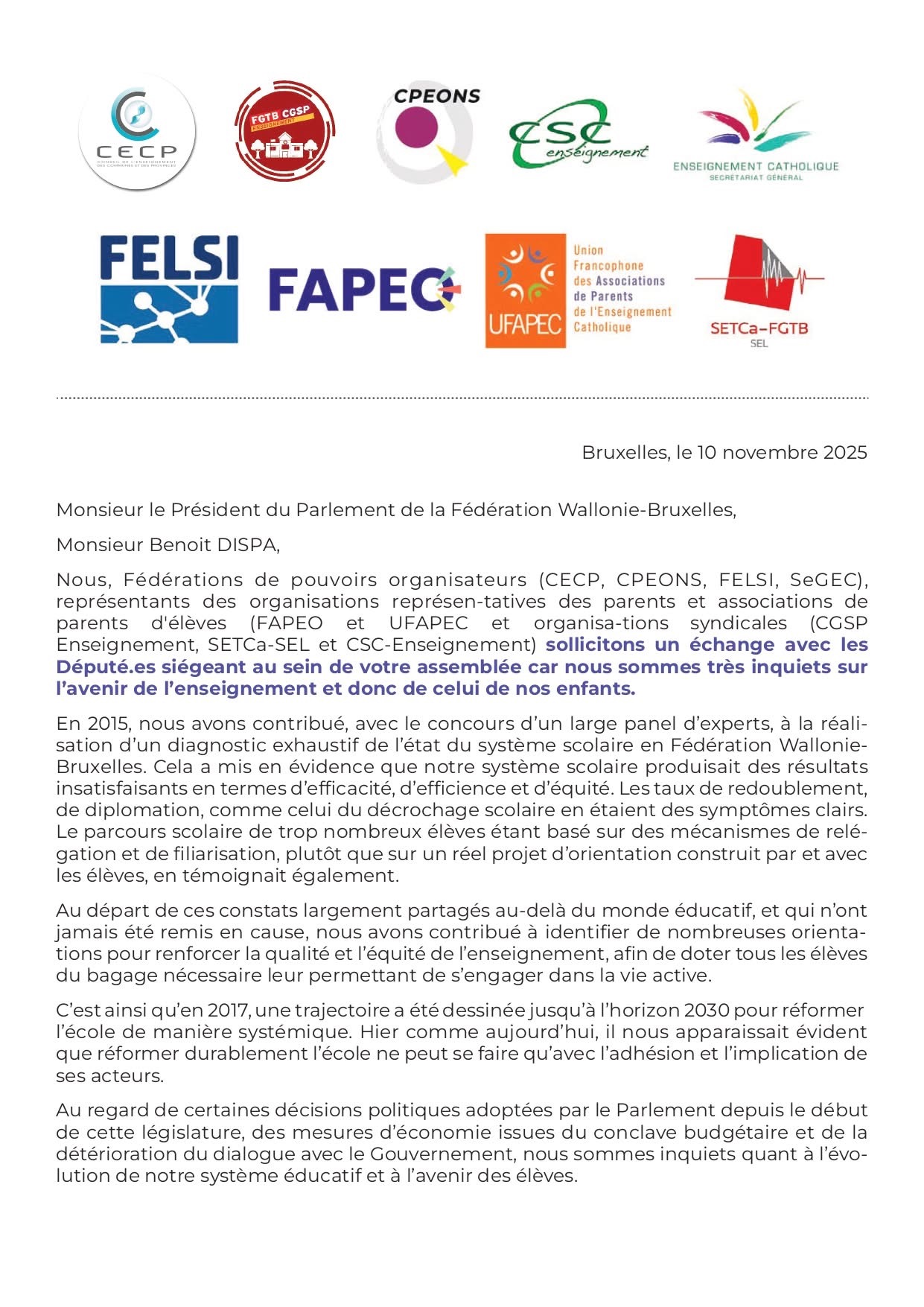 Les pouvoirs organisateurs, les syndicats et les associations de parents – tous signataires du Pacte d’excellence – signent ensemble un courrier. Ils y témoignent leur vive inquiétude pour l’avenir de l’école et sollicitent une audition par le parlement. Un front commun historique.