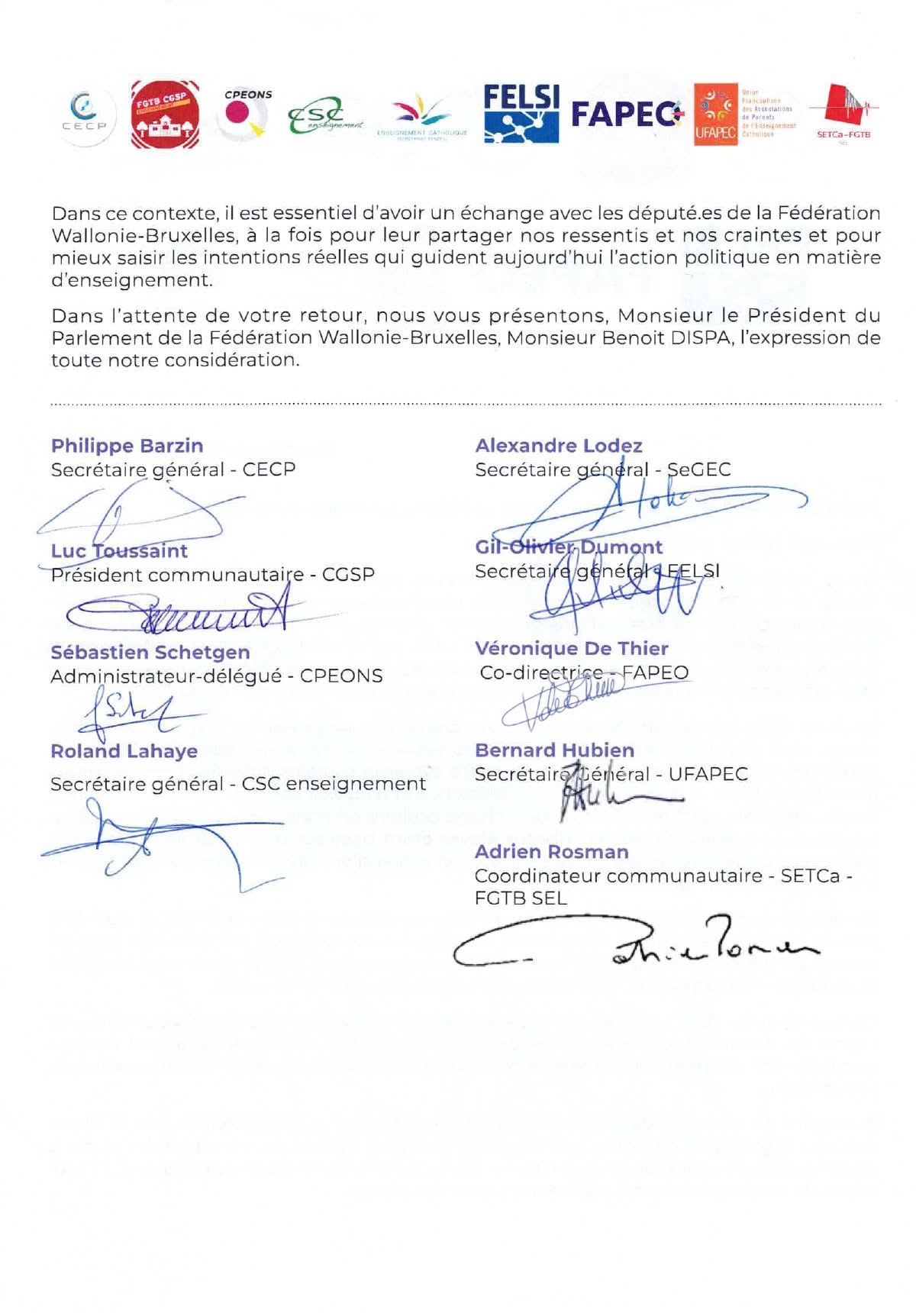 C’est probablement du jamais vu. Et ça en dit long sur l’état des relations entre les acteurs de l’enseignement et le gouvernement de la Fédération Wallonie-Bruxelles. Ce jeudi, le président du parlement francophone a reçu une demande formelle d’audition par les députés. Au bas du courrier, neuf signatures : Philippe Barzin, secrétaire général du CECP (l’enseignement fondamental des communes et provinces), Alexandre Lodez, secrétaire général du Segec (la fédération de l’enseignement catholique), Sébastien Schetgen, administrateur du Cepeons (le secondaire et le supérieur officiels subventionnés des communes et provinces), Gil-Olivier Dumont (secrétaire général de la Fédération du libre indépendant), Luc Toussaint, président de la CGSP enseignement, Roland Lahaye, président de la CSC enseignement, Adrien Rosman, coordinateur du Setca pour le libre, Véronique Dethier et Bernard Hubien respectivement leader des fédérations de parents de l’officiel et du libre. Il ne manque que les syndicats libéraux et le réseau officiel Wallonie-Bruxelles Enseignement.