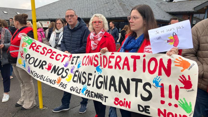 La première heure de cours dans les établissements de primaire et maternelle n’a pas eu lieu ce matin à Flémalle, en région liégeoise. Les enseignants ont manifesté devant les écoles, avec des messages qui vont tous dans le même sens. Anaïs Beaufort, institutrice s’indigne : « C’était vraiment inacceptable. Donc on ne peut pas laisser passer ça. Si on laisse passer ça, où va-t-on ? ».